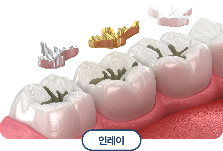 충치 깊이에 따라 레진(초기), 인레이/온레이(중기, 부분 수복),